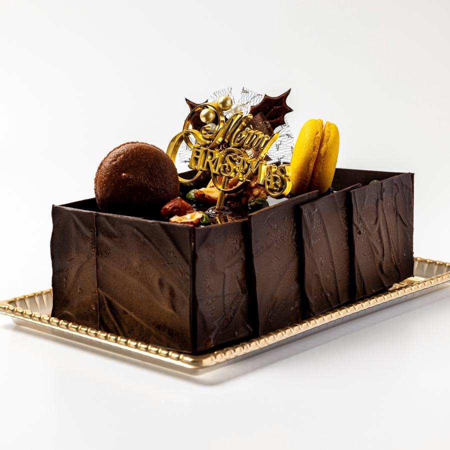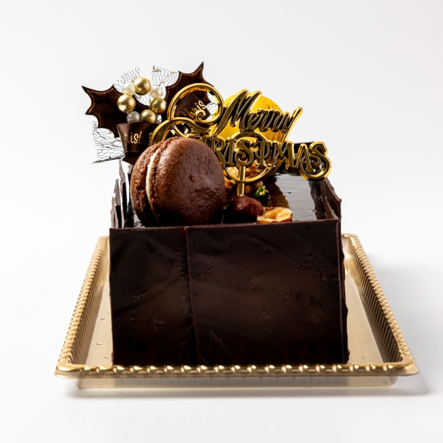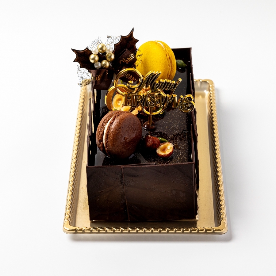 アーモンド香るダックワーズ生地の上には、なめらかで濃厚なチョコムース。ムースの間にはヘーゼルナッツのクリームが層になっています。