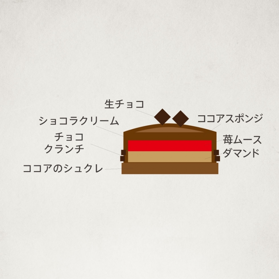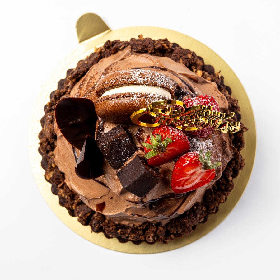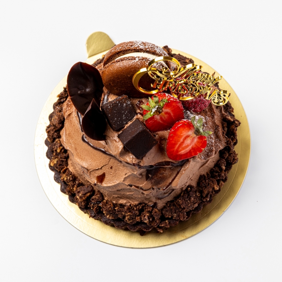 フランボワーズジャムを入れて焼き上げたチョコタルトに苺ムースをのせてココアスポンジとショコラクリームでドーム型にしたチョコタルトケーキです。