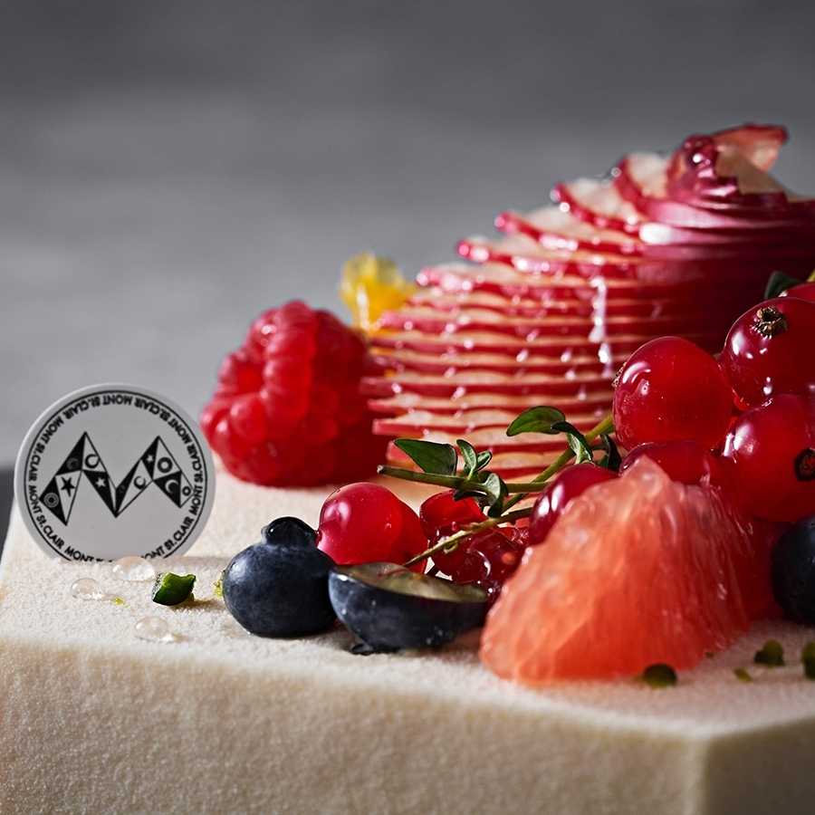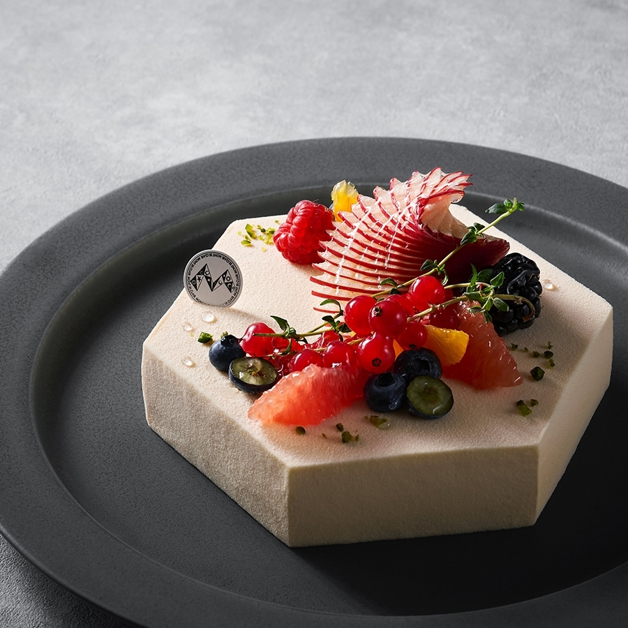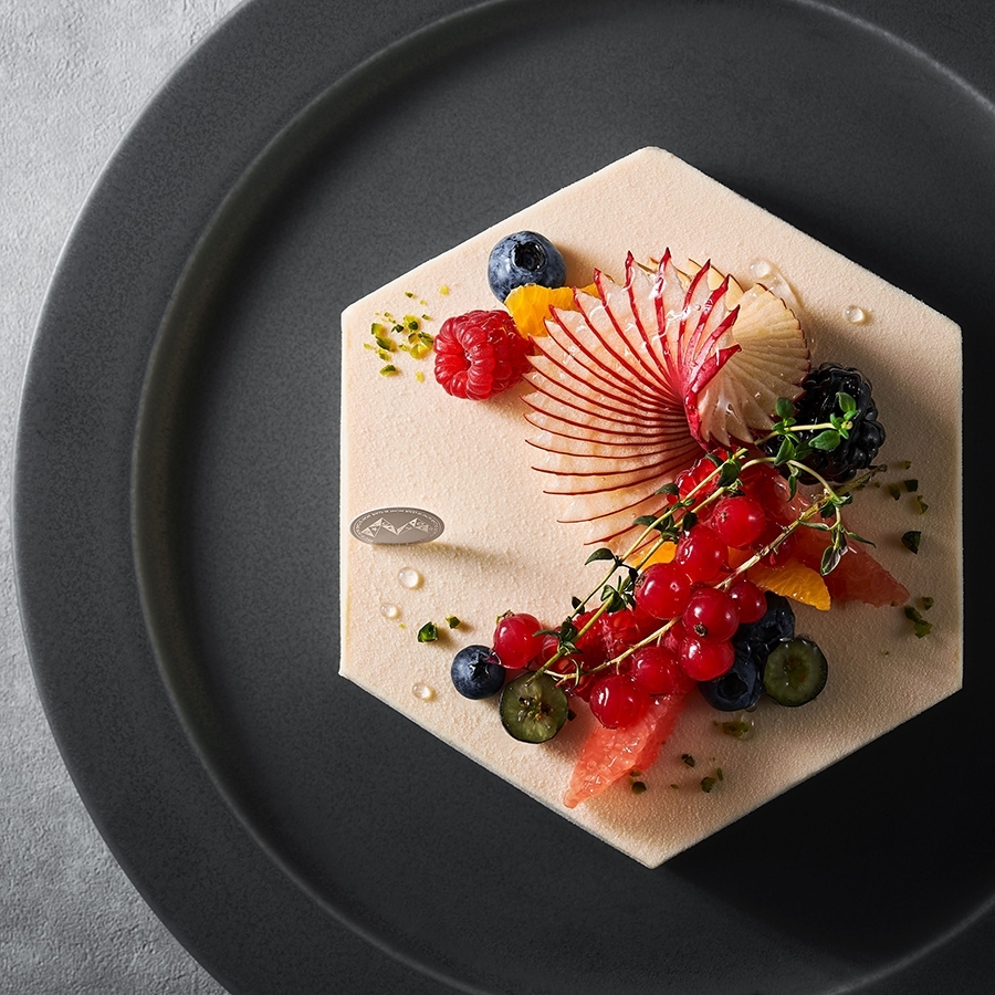 ケーキのシルエットはフランス本土をイメージさせる六角形。日本人であると共にフランス菓子を愛するパティシエであるというメッセージが込められています。