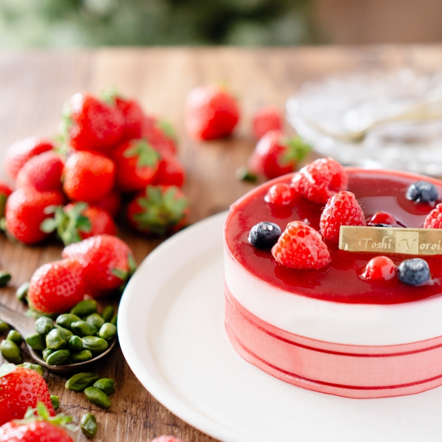 優しい甘さのいちごのムースに、甘酸っぱいフランボワーズのジュレと濃厚なピスタチオのクリームを合わせて華やかに。