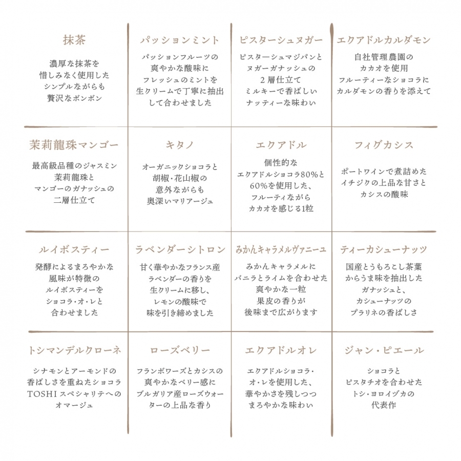 それらを注ぎ込み、こだわりにこだわり抜いた至高のボンボンショコラの世界を、心ゆくまでお愉しみください。