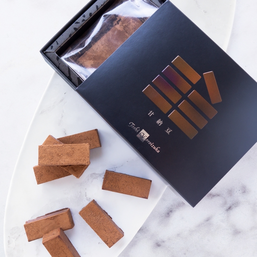 なめらかな生チョコレートに、少し塩味の効いた甘納豆を混ぜ込んだ和テイストショコラ。
