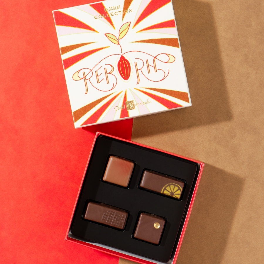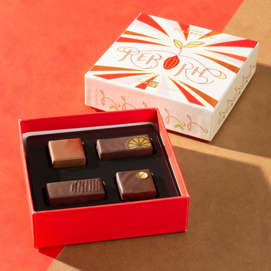 鎧塚シェフのスペシャリテ「トシ・マンデルクローネ」をボンボンショコラで再現したり、小田原のみかんやピスタチオなどシェフのこだわりを詰め込んだ至高の4粒。