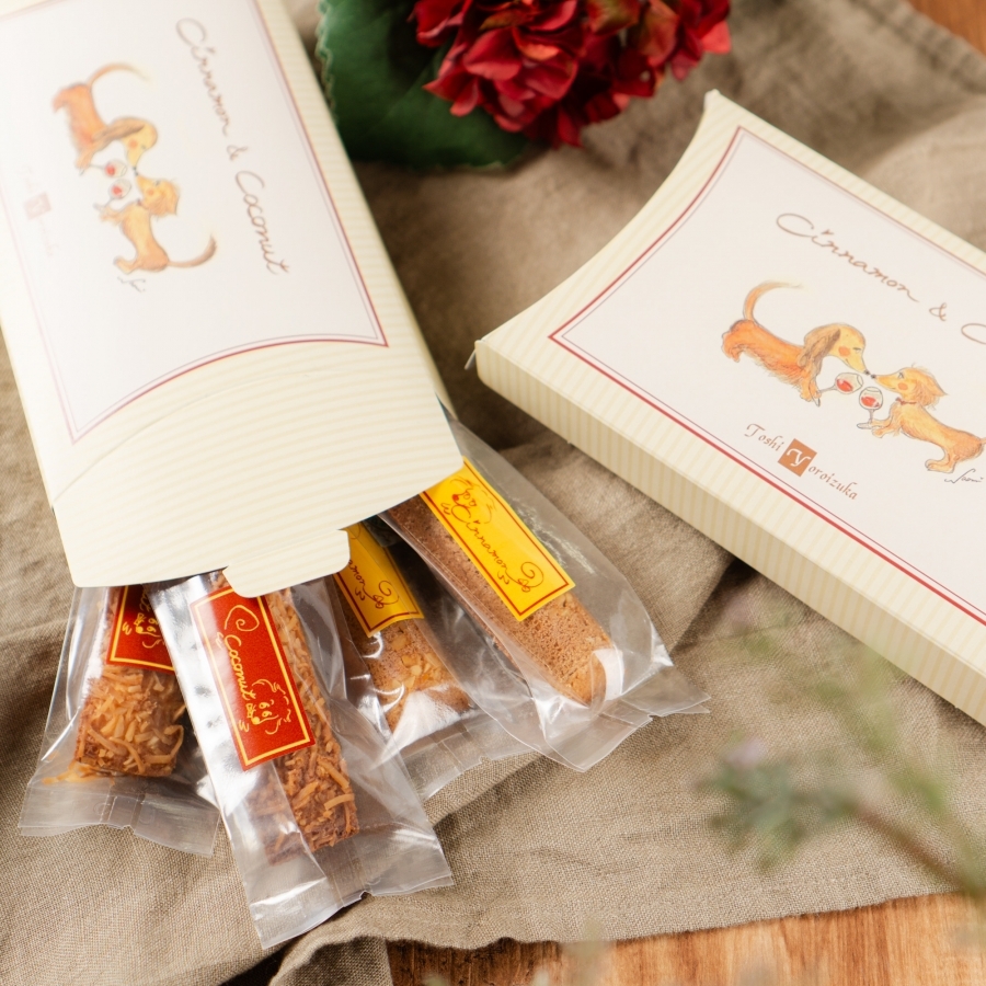 シェフ鎧塚の2匹の愛犬「シナモン」と「ココナツ」をモチーフにした想い出の焼き菓子。