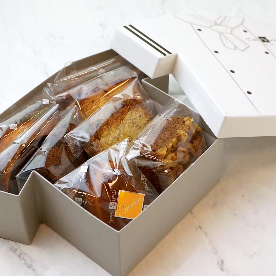 シェフのコックコートをかたどったポップな箱に、人気の焼菓子8個を詰め合わせました。