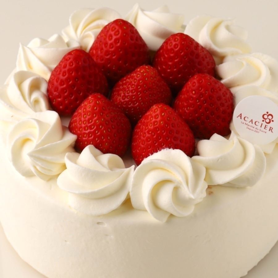アーモンドを使ったしっとりふわふわのスポンジ生地と、カスタードクリームでコクをプラスした北海道産の純生クリームで、甘酸っぱいイチゴをたっぷりサンドしました。アカシエこだわりのショートケーキです。