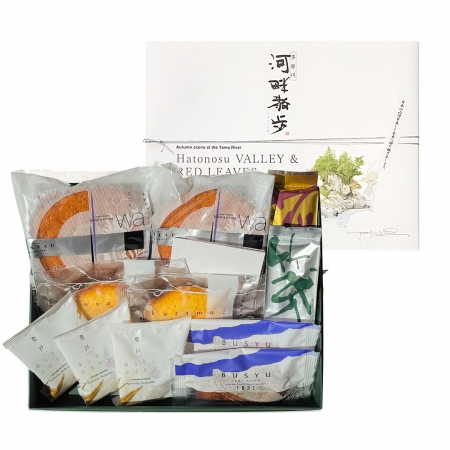 こころのWa、私のすきなもの(甘納豆)、ゆらりとのぼりと、マドレーヌ、多摩川ブラウニーショコラ、リンツァー、やませみサブレなど、当店オススメの焼き菓子などが入っております。