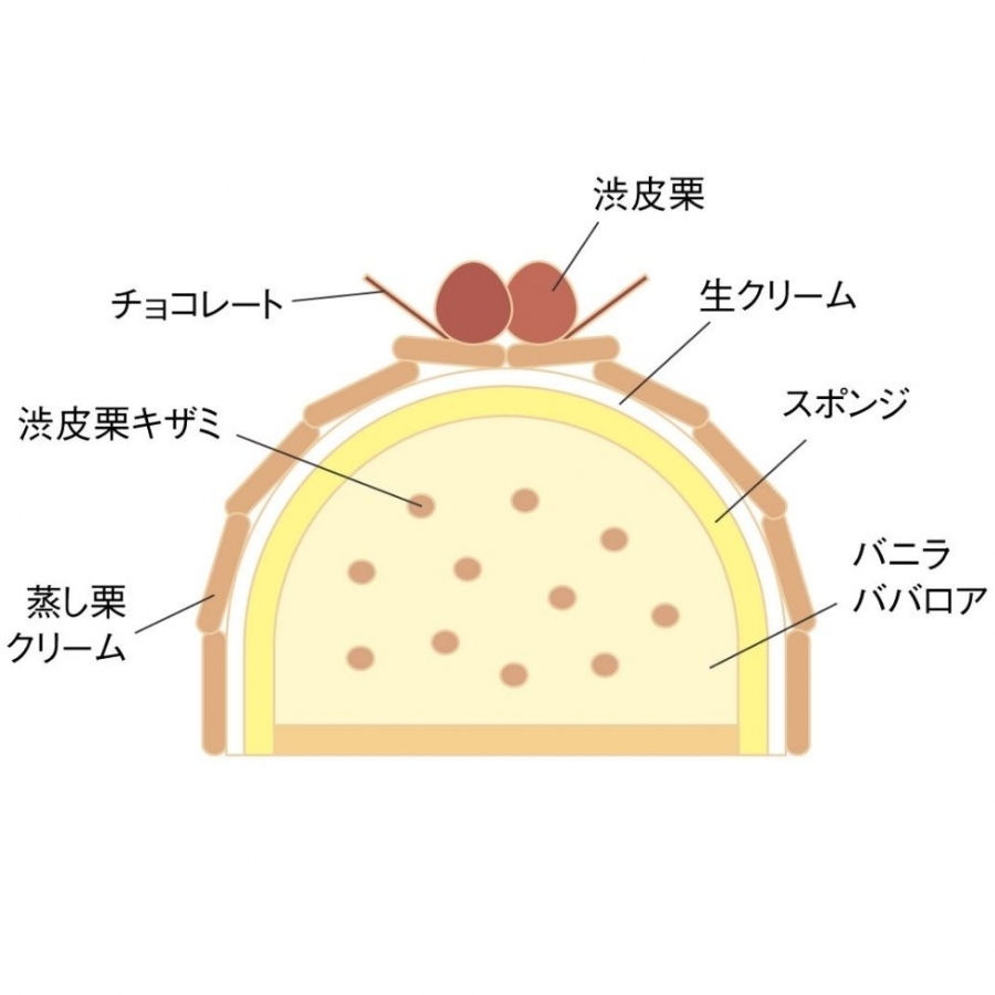 渋皮栗の刻みが入ったバニラのババロアを、生クリームと蒸し栗ペーストで仕上げたアントルメ。