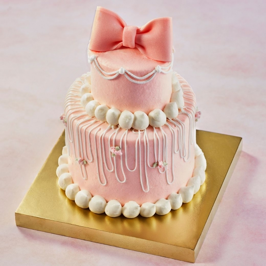 キュートなリボンが目を惹く、プリンセスのドレスのようなデコレーションケーキ。
