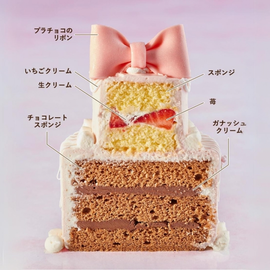 下段には濃厚でくちどけのよいガナッシュをサンドしたチョコレートケーキ、上段にはアニバーサリーで定番人気のショートケーキを使用。1度に2つの味のマリアージュを楽しめます。