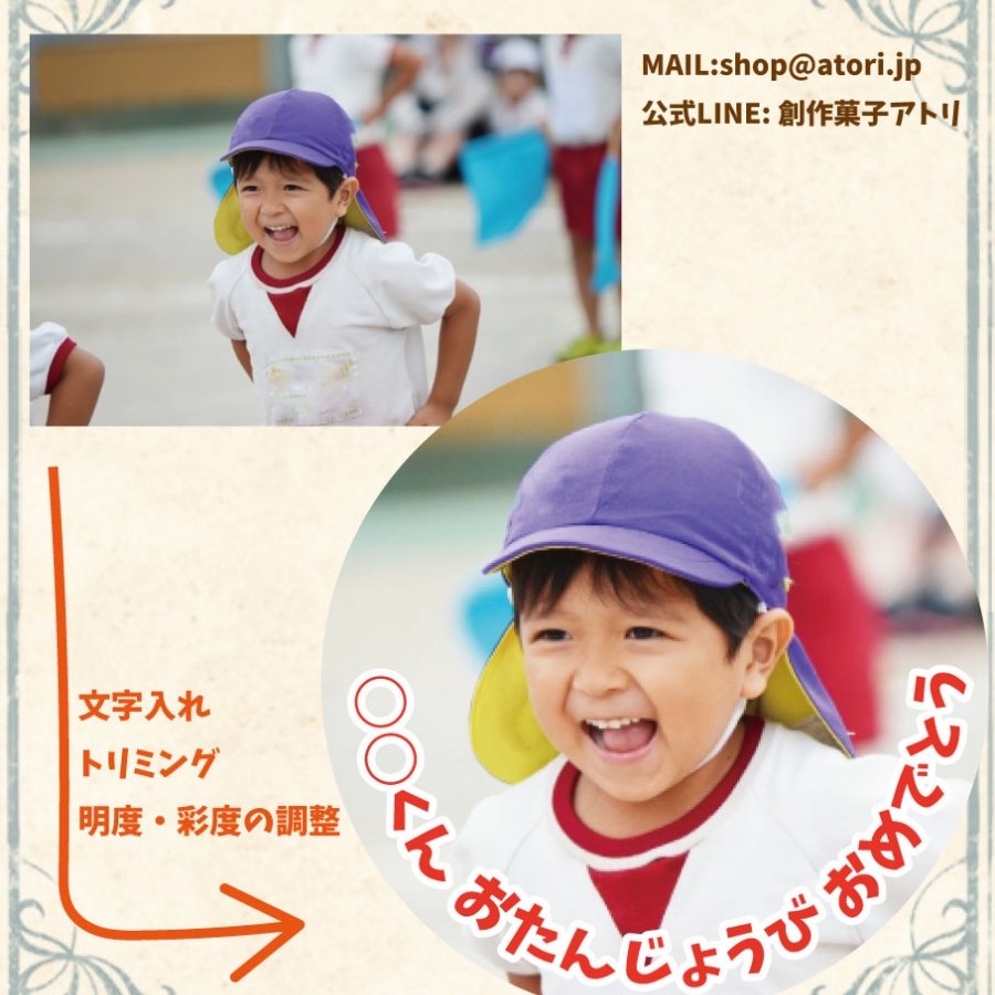 ※「文字入れ」「トリミング」「明度・彩度の調整」以外の加工は承れません。