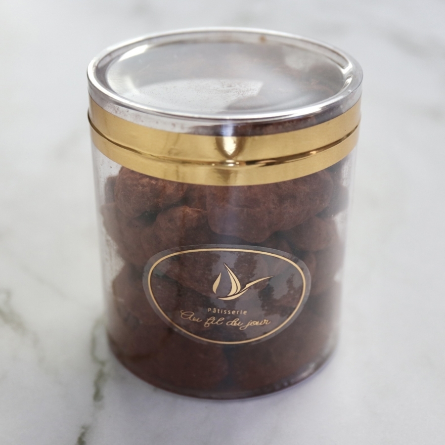 ミルクチョコレートとビターチョコレートでコーティング、仕上げにカカオプードルでリッチに。