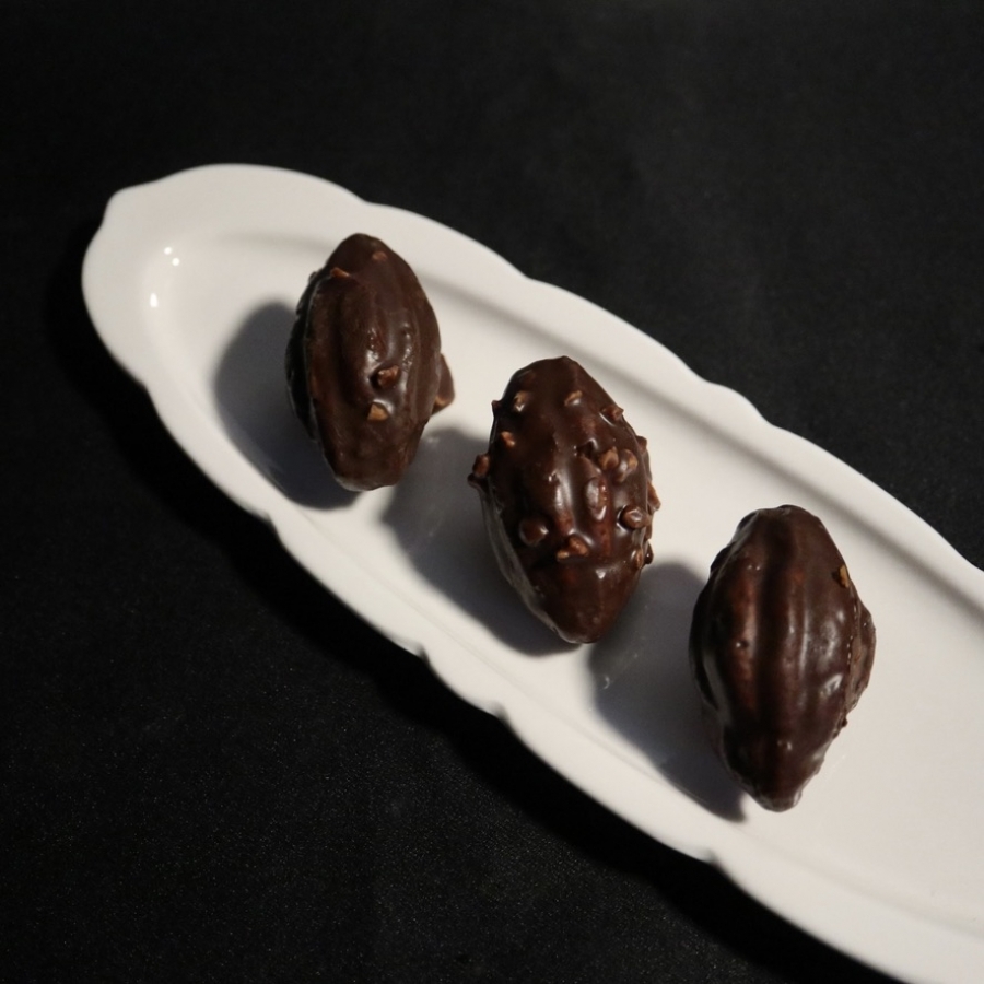 アーモンドダイスと共にチョコレートがけ。