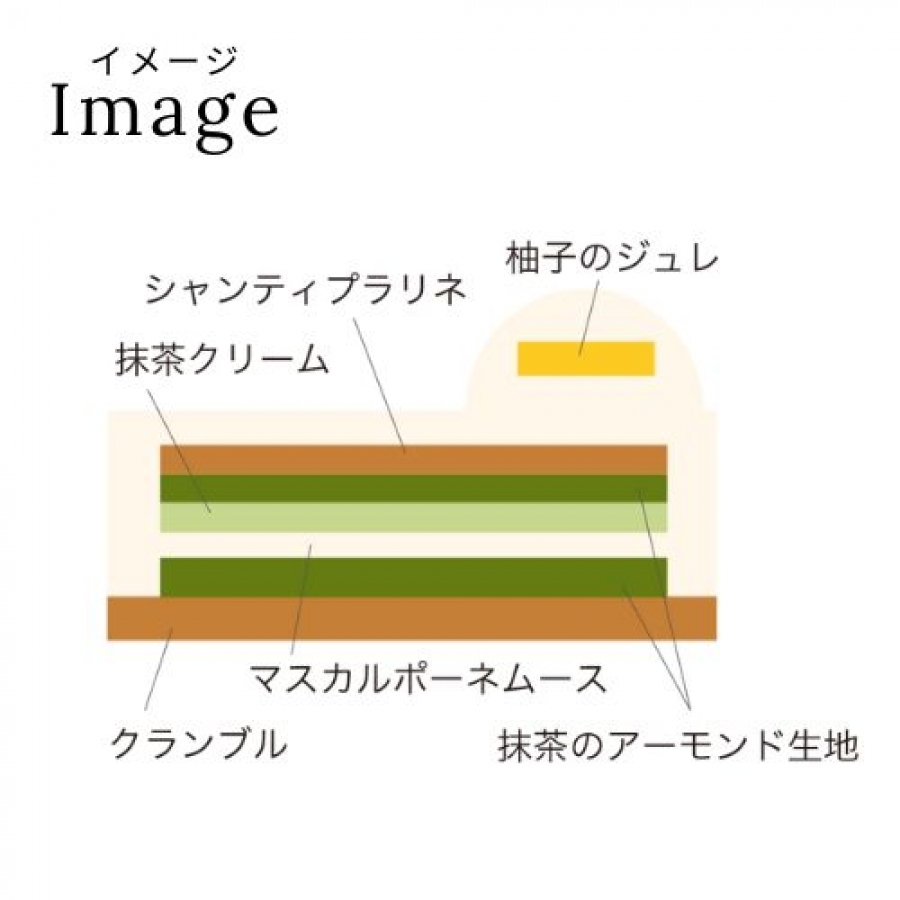 抹茶アーモンドの生地と抹茶クリームをマスカルポーネムースで包み込み、アクセントに柚子のジュレをしのばせた見た目も可愛いクリスマスケーキ