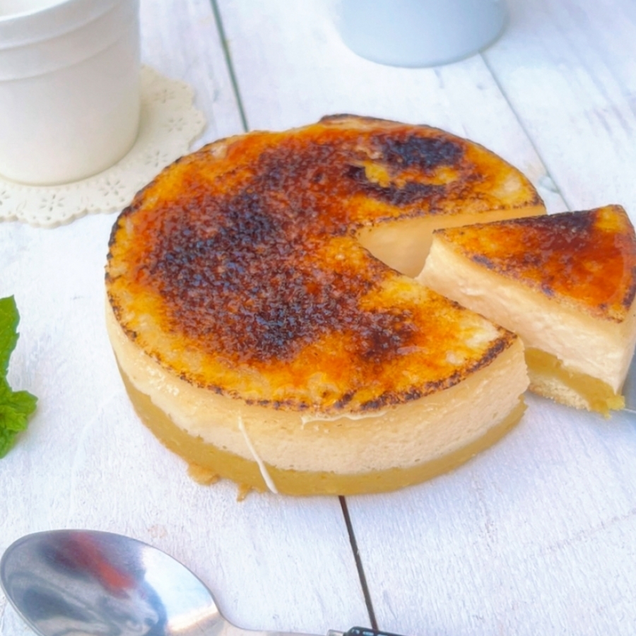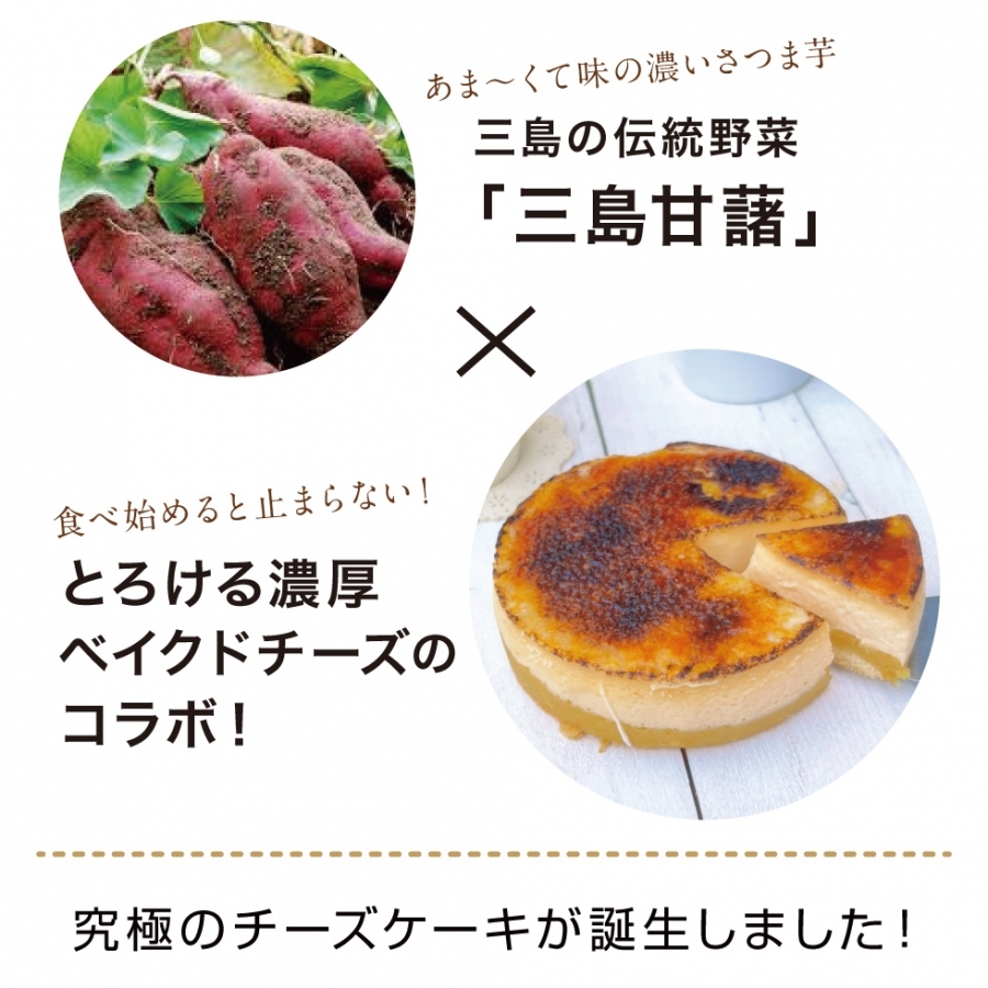 三島市の特産品「三島甘藷」を使用した生地の上に、なめらかで濃厚なベイクドチーズを重ね、表面を香ばしくキャラメリゼしました。