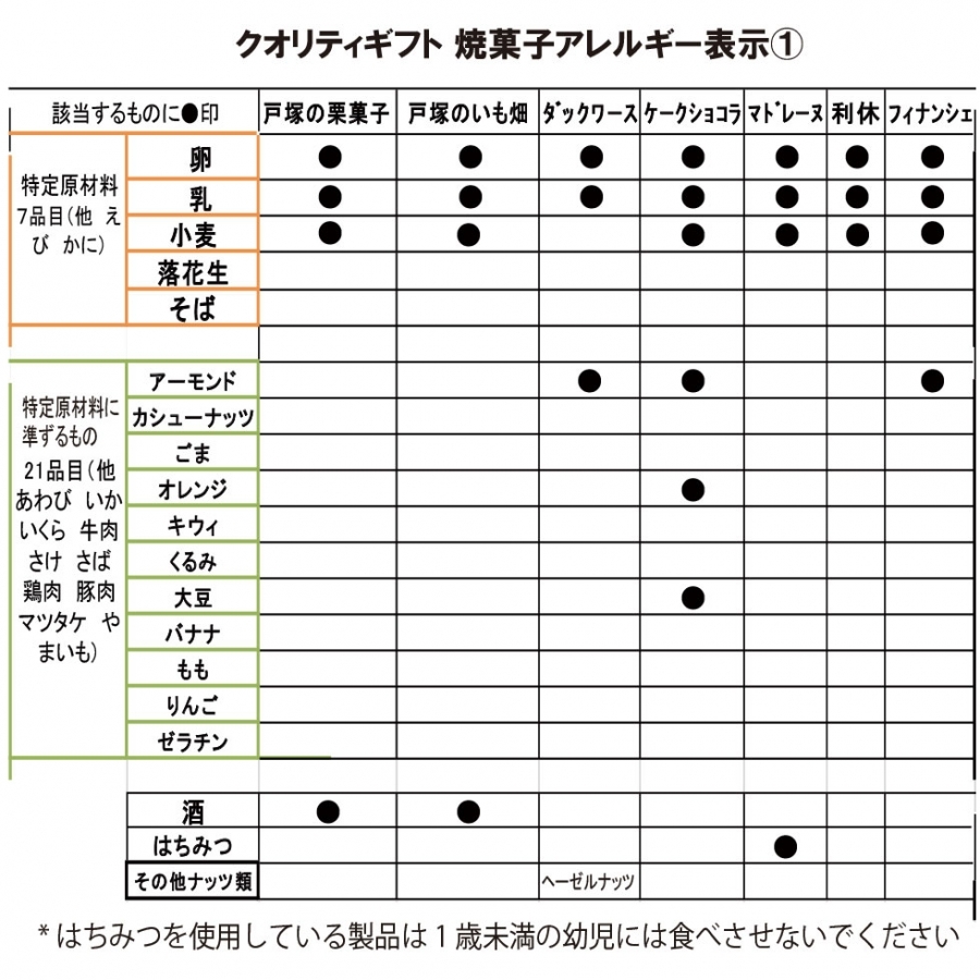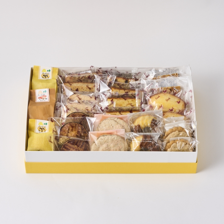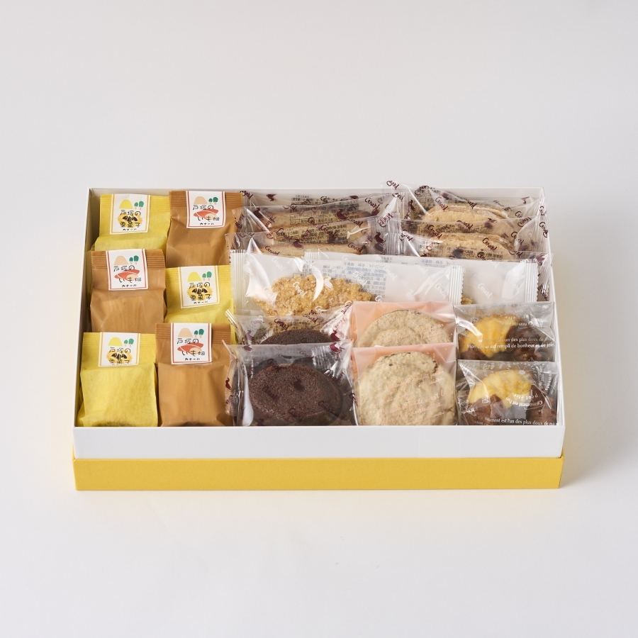 25個入:戸塚の栗菓子2個、戸塚のいも畑1個、フロランタン2個、フィナンシェ2個、ダックワーズ2個、マドレーヌ2個、オレンジケーキ2個、フルーツケーキ2個、クグロフ2個、クランベリーショコラ2個、ガレット2個、マカロン2個