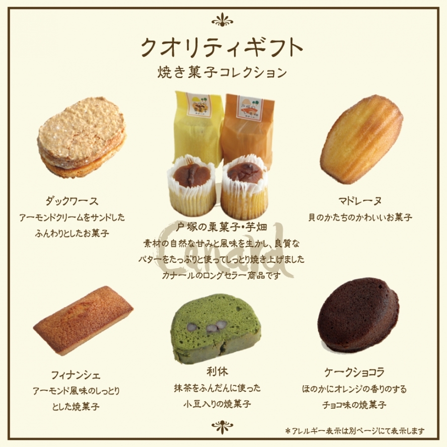 カナールのロングセラー商品である戸塚の栗菓子・芋畑をはじめとする人気の焼き菓子を、バラエティ豊かに詰め合わせました。カナールのギフトの定番シリーズです。