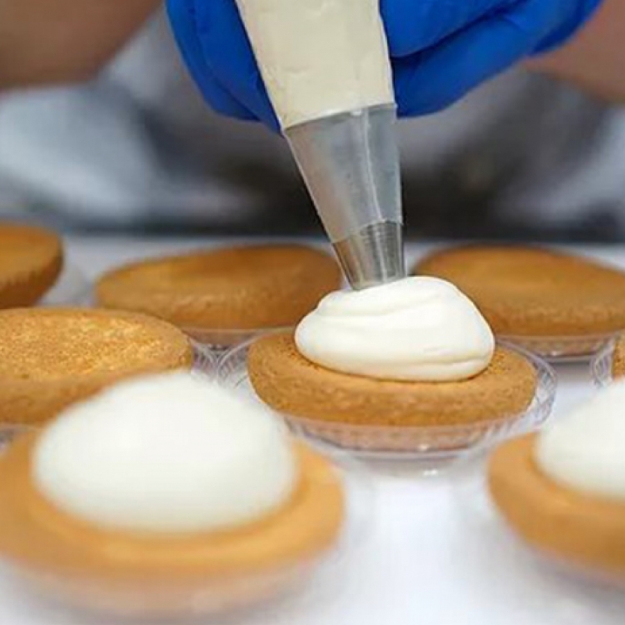 ふわっとした優しい口当たりが特徴で、生地には吉野くずで食感を出しています。たっぷりのクリームはホワイトクーベルチュール、フレッシュバター、生クリーム、卵を使用しておつくりしております。