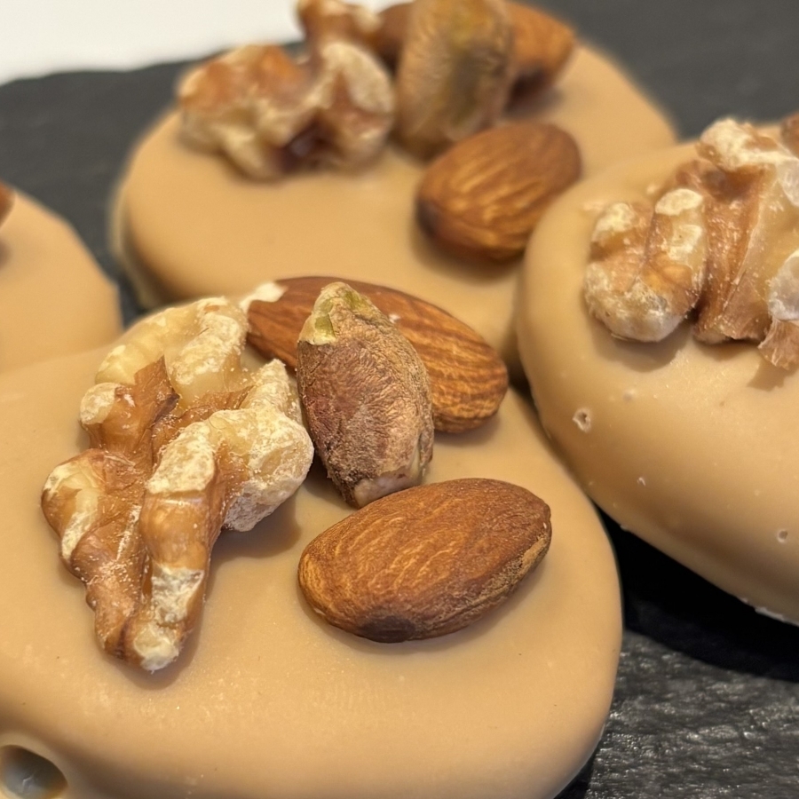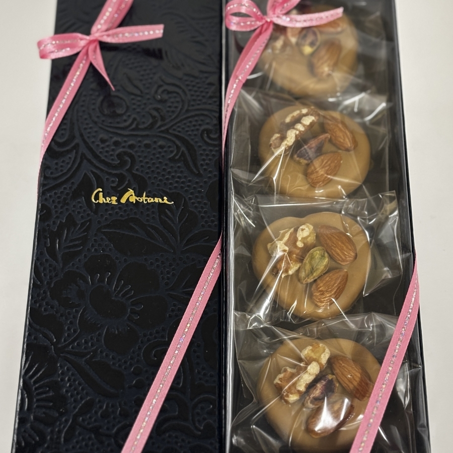 可愛らしいハート型のクッキーの上にチョコレートをコーティングして上にナッツを乗せています。