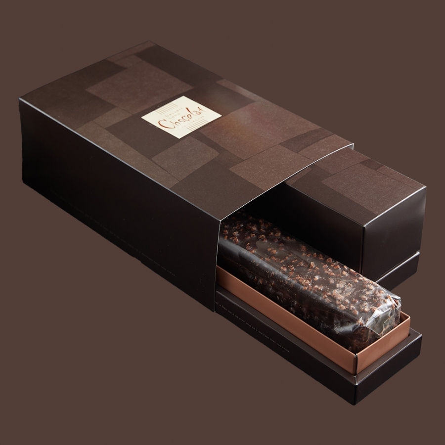 ガーナ産56%のチョコレートを使用したチョコパウンドに、アーモンド入りのグラサージュでコーティングしました。