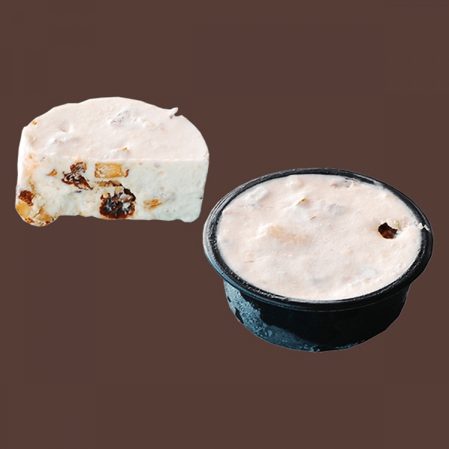 クリームチーズにクッキー、アーモンド、泡盛漬けにしたレーズンを閉じ込めた、アイスクリーム仕立てのケーキ。