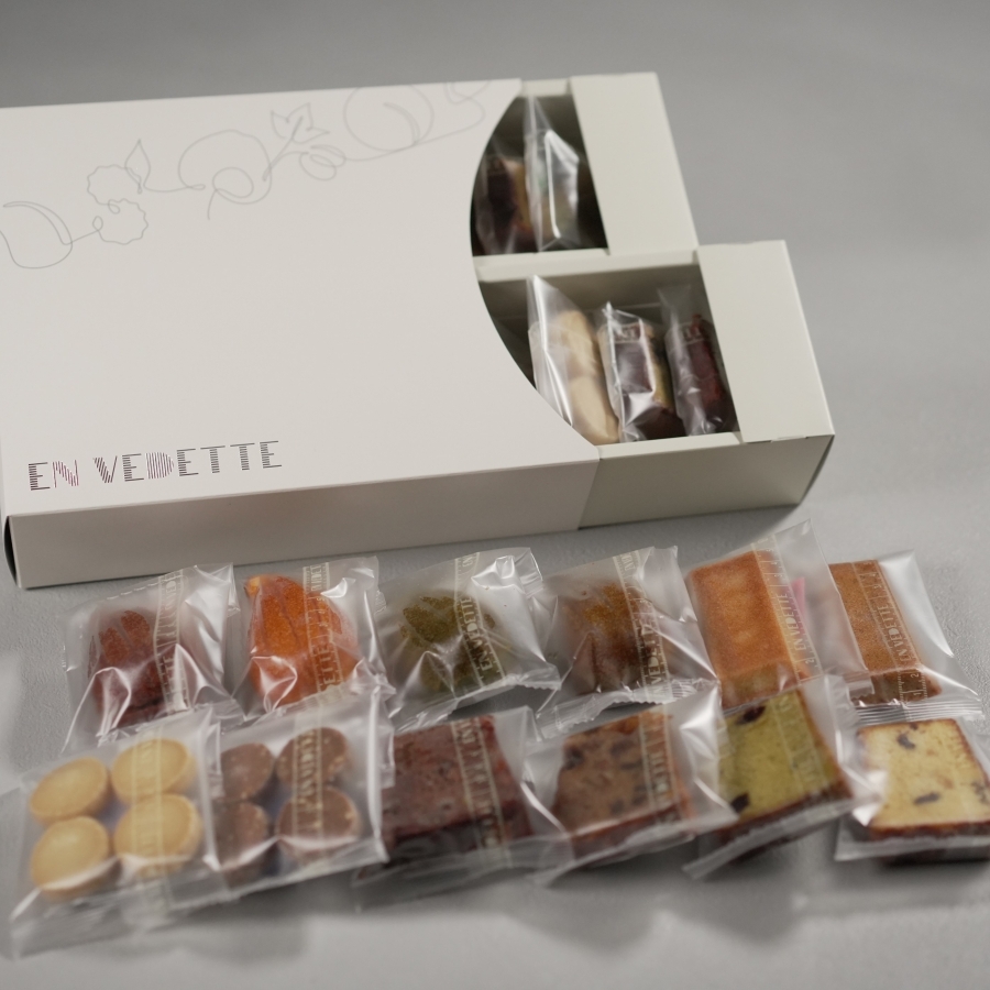 12個入:マドレーヌ・マドレーヌショコラ・マドレーヌほうじ茶・マドレーヌ抹茶・フィナンシェ・フィナンシェメープル・ケークフリュイ・ケークショコラ・ケークピスターシュ・ケークエピス・ディアマンバニラ・ディアマンショコラ・
