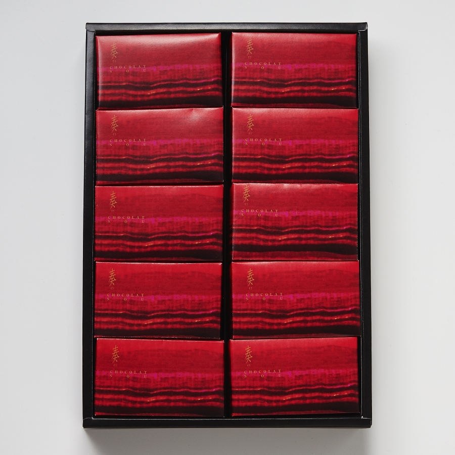 リニューアルしたパッケージは、「カカオ豆特有のポリフェノールの色やカカオポッドに表れる赤色などが、“チョコレート色”の根っこにあるような気がして、この色合いのグラデーションにしようと思った」と、シェフ小山が実際に白いキャンパスに描いたデザインがそのまま表現されています。