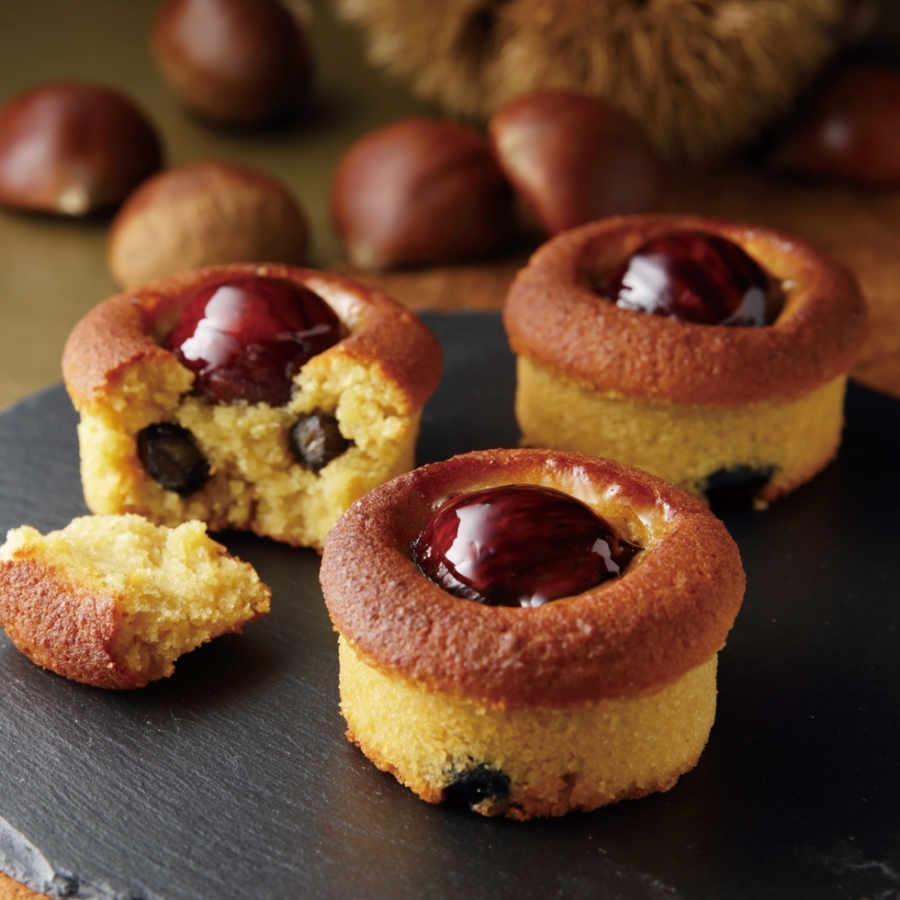 栗ペーストをベースに、アーモンドをたっぷり使用したクレームダマンド、カスタードを練り込んだ生地を独自の製法で焼き上げました。渋皮マロンと丹波の黒豆が、上品な味わいと栗の風味が奏でる深みのある味わいをつくり出しています。