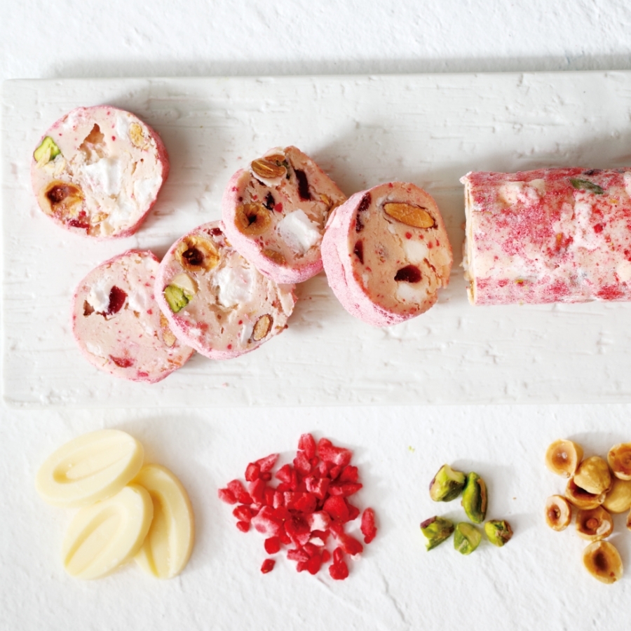 ホワイトチョコレートにフリーズドライ苺、ピスタチオ、オレンジピール、カシューナッツ、アーモンド、ヘーゼルナッツ、マショマロを練りこんだ「ソシソン・フレーズ」。様々な食感や食味が楽しめ、甘すぎないのが特徴です。