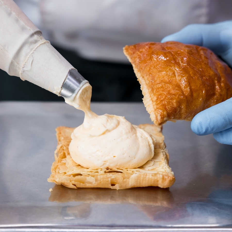 お渡し直前にパイにクリームをしぼり入れるので、焼きたての風味と食感をお楽しみいただけます。