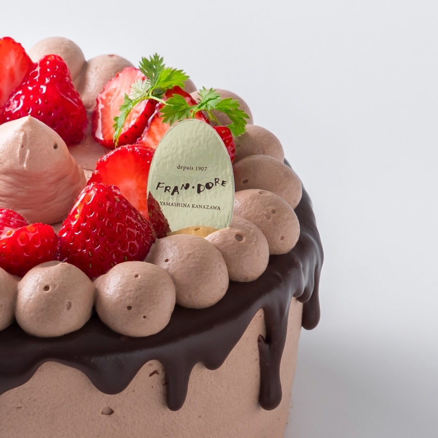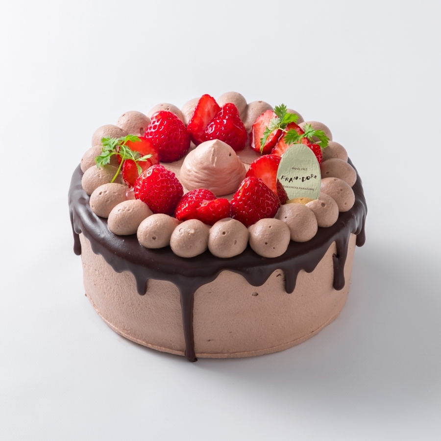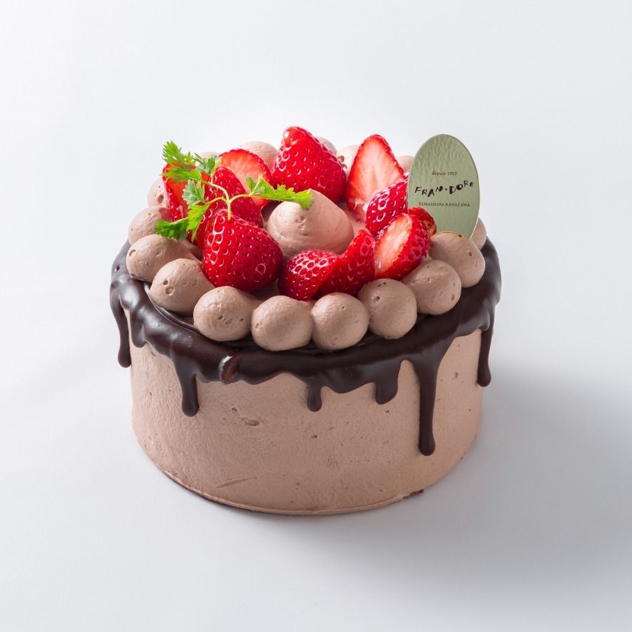 チョコレートソースでドリップ風に仕上げた、可愛らしい苺のデコレーションケーキです。
