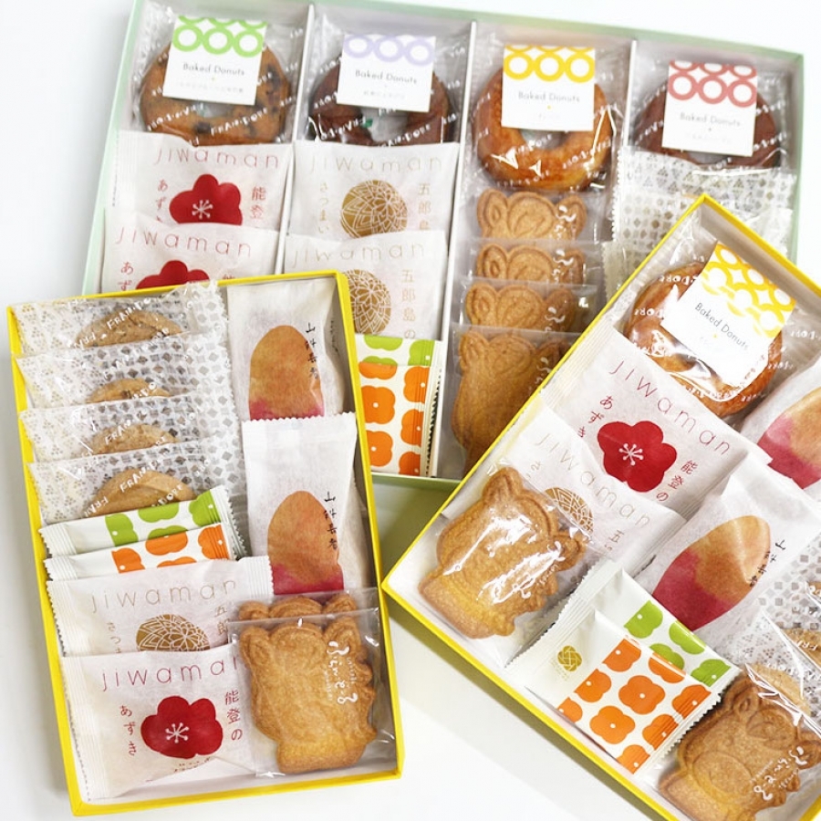 五郎島のおいもやき(山科長者)2個、クッキー(お味はランダム)4枚、茶の間ショコラ(加賀棒茶)1枚、茶の間ショコラ(抹茶)1枚、金沢みるく饅頭じわまん(能登あずき)1個、金沢みるく饅頭じわまん(五郎島のさつまいも)1個、干支クッキー2枚