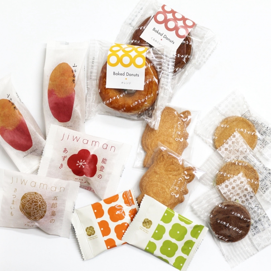 クッキー(お味はランダム)6枚、茶の間ショコラ(加賀棒茶)2枚、茶の間ショコラ(抹茶)2枚、金沢みるく饅頭じわまん(能登あずき)2個、金沢みるく饅頭じわまん(五郎島のさつまいも)2個、ベイクドドーナツ(お味はランダム)4個、干支クッキー4枚
