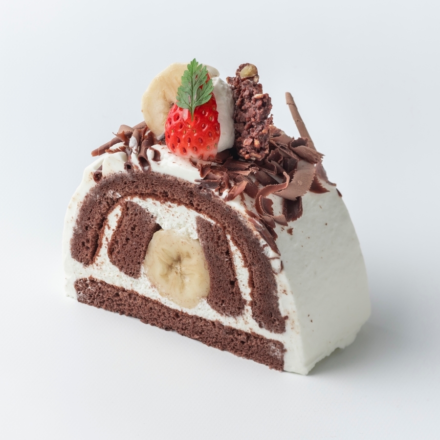 しっとり焼き上げたチョコレート生地と、口どけの良い生クリームとまるごとバナナで作ったケーキです。