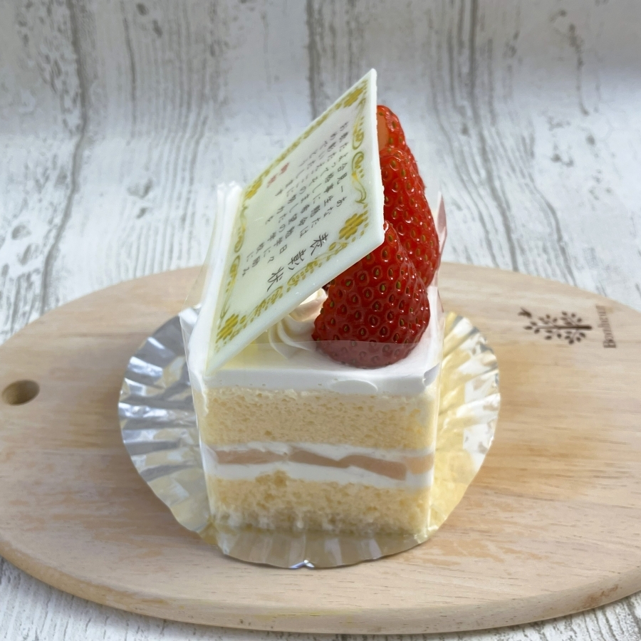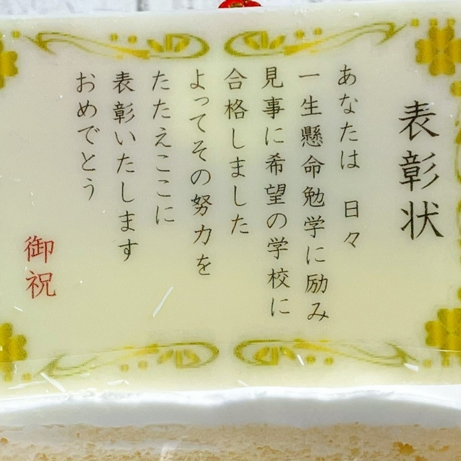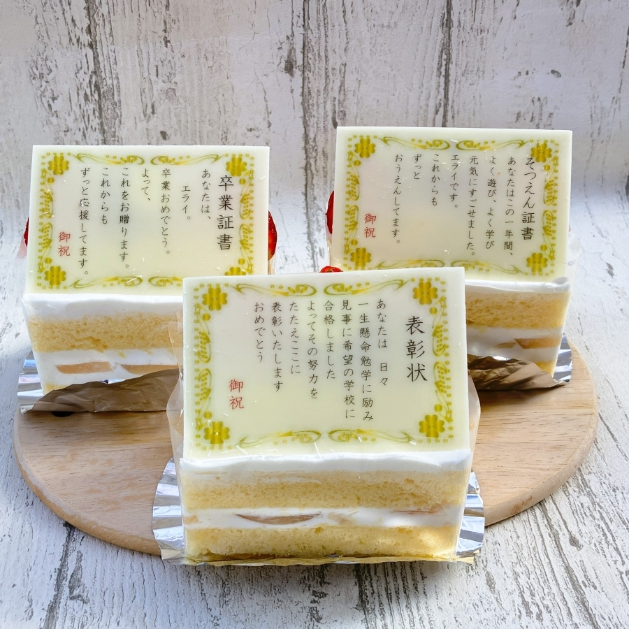 合格のお祝いに、ふわふわで、口どけの良いスポンジ生地に、フレッシュクリームと白桃でサンドしたショートケーキはいかがでしょう?ホワイトチョコレートで作った”表彰状”がひかります