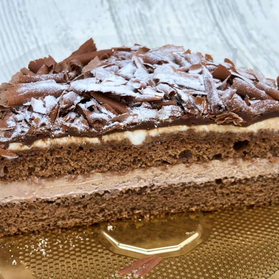 くちどけなめらかな生チョコクリームに、ココアのスポンジケーキを重ねて、まわりを生クリームとガナッシュチョコでコーティングした贅沢な味わい。