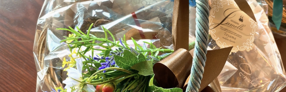 色んな種類の焼き菓子をかごに盛り付けて♪季節の花飾りラッピングします(*'▽')