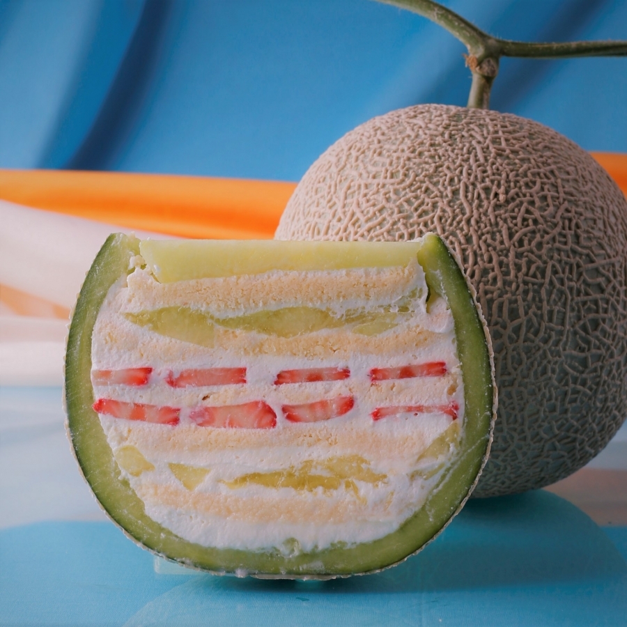 中身をくりぬいたメロンの中にふわふわのスポンジケーキ、生クリーム、マスクメロンの果肉、苺がミルフィーユ状に丁寧に詰め込まれています。