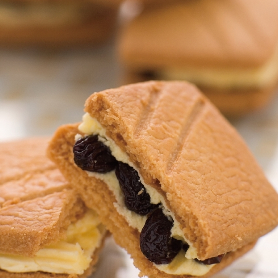 ほろほろサクサクのサブレにじっくりと漬け込んだレーズンとクリームをサンドしました。職人手作りの逸品です。