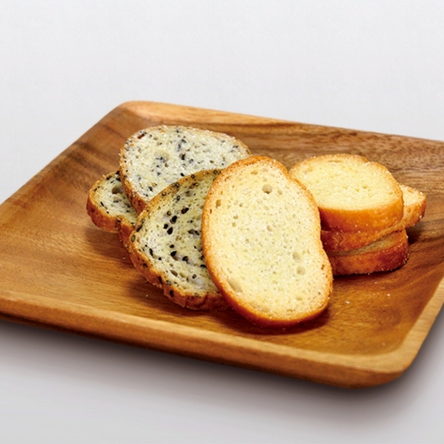 ・ラスク:サクサクの絶妙な厚みにカットしたラスク専用に焼上げたフランスパンを、シュガーとごまの香ばしくもコクの有る後味のラスクにしあげました。