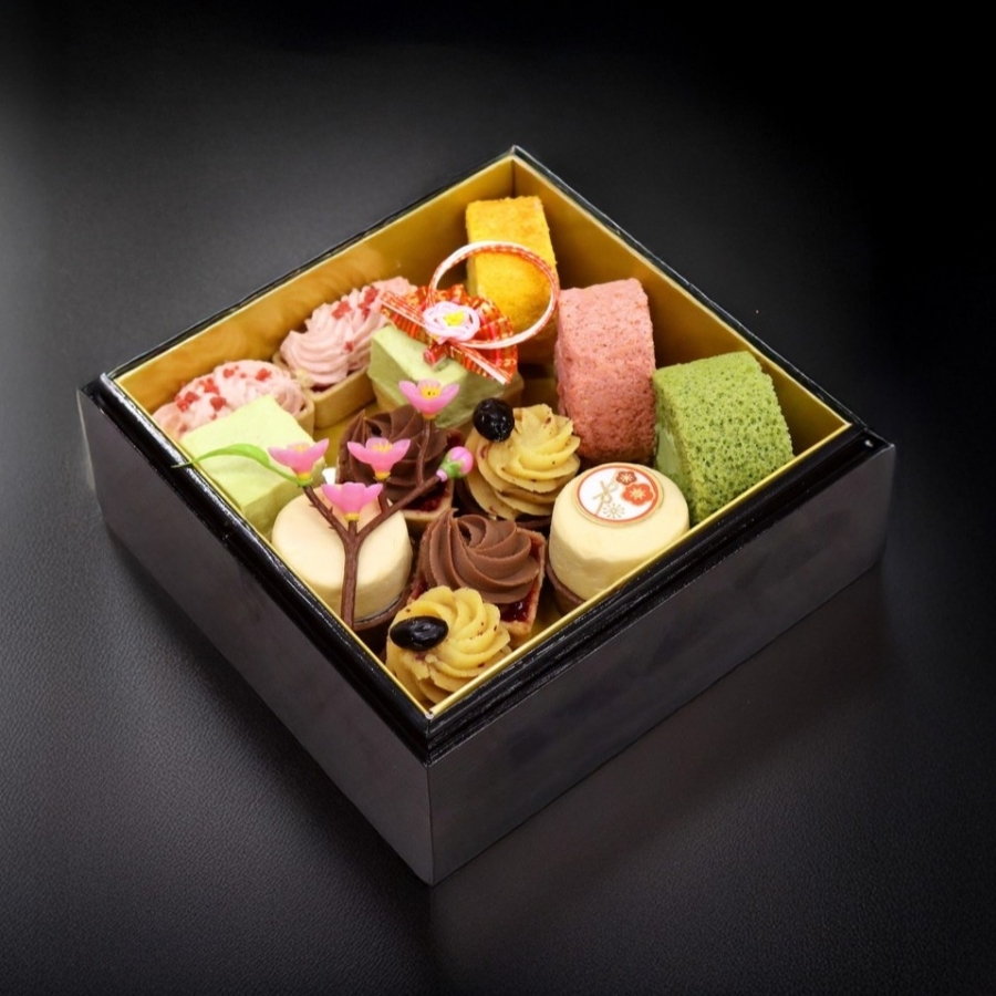 | 1段目 | プチガトー(ミニロール 苺、かぼちゃ、抹茶)、プチタルト(ピスタチオ、チョコ、りんご、苺、お芋) |