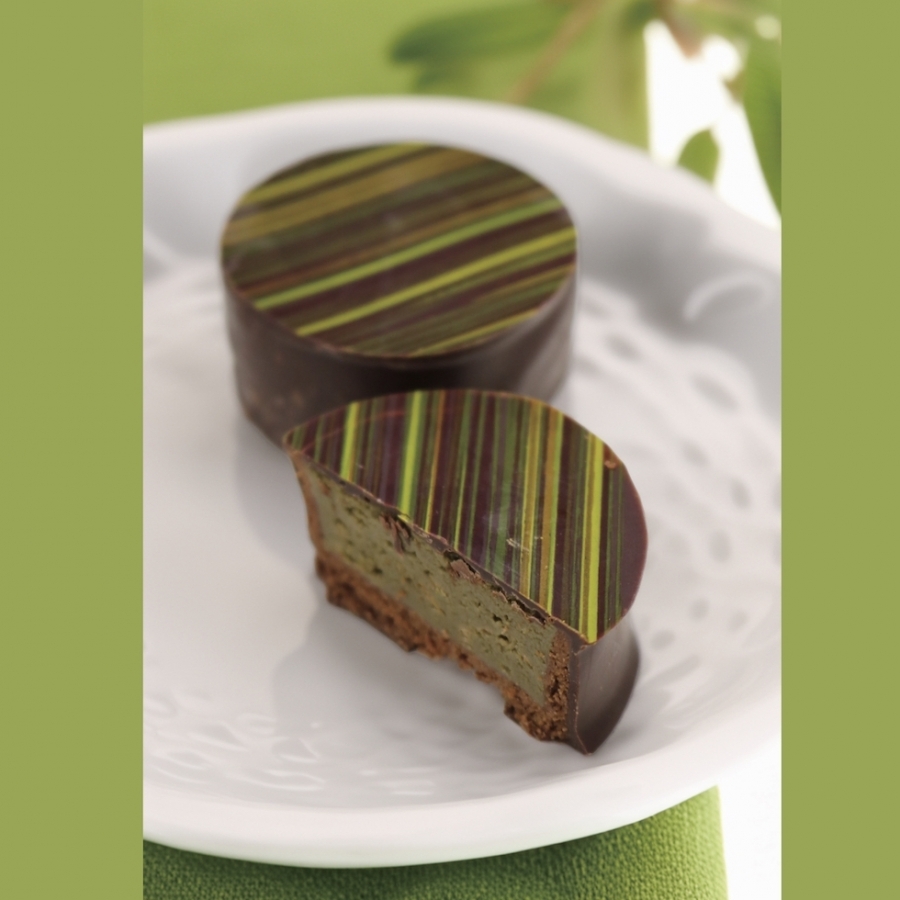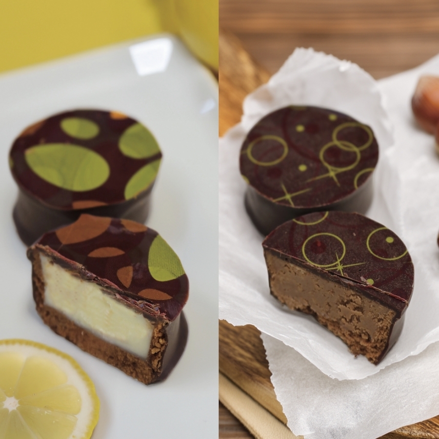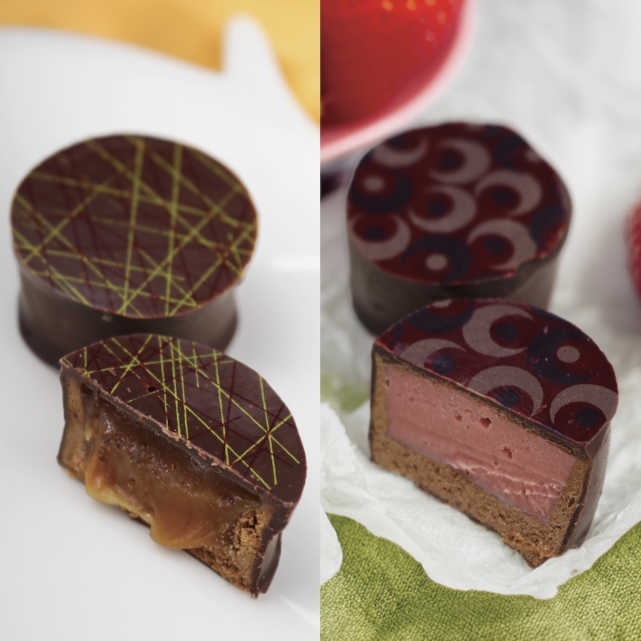 さっくりとしたタルト生地の中に苺、シトロン、ヘーゼル、ピスタチオのガナッシュと、塩キャラメルを閉じ込め、チョコでコーティング。