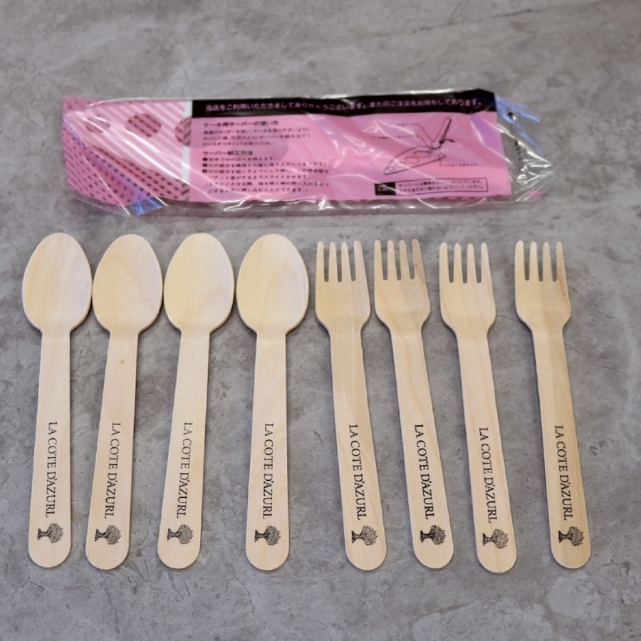 すぐにとりわけができる、簡易ナイフにもなるケーキサーバーとフォークとスプーンをおつけしております。