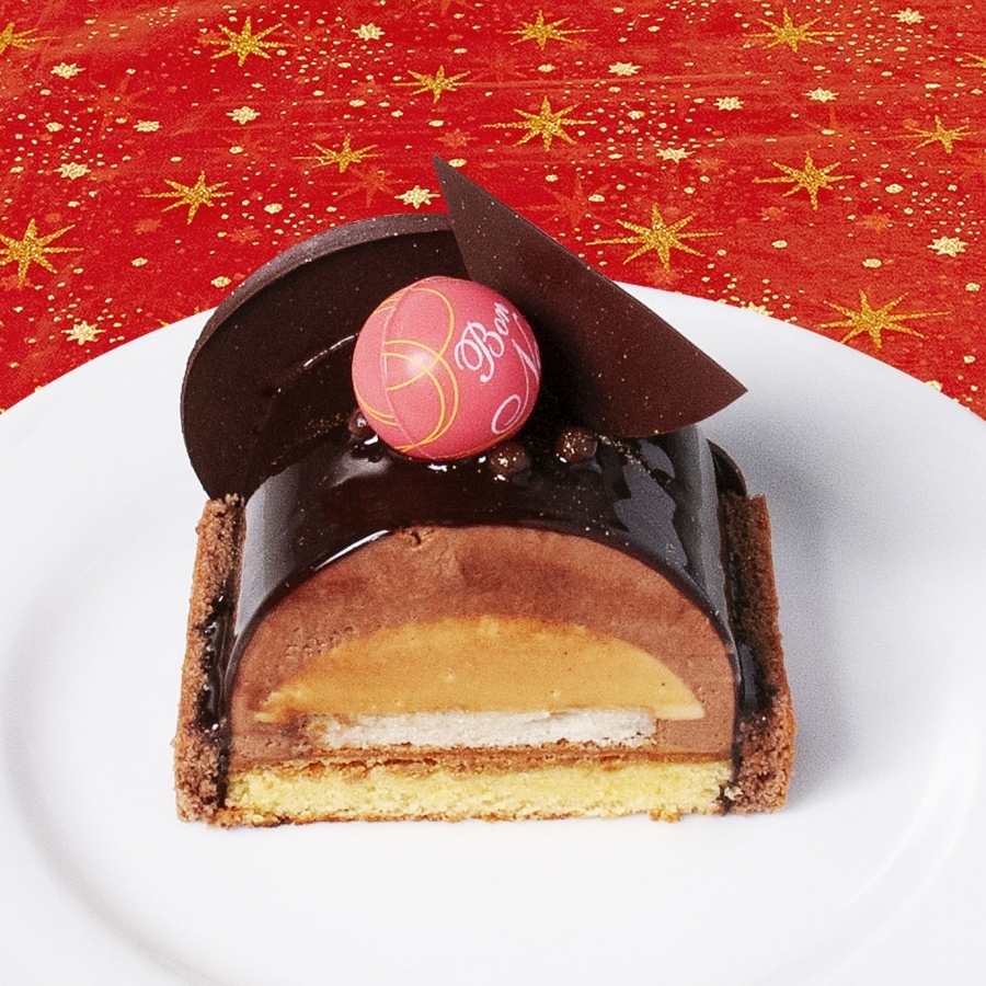 しっとり焼き上げたアーモンドフィナンシェを、濃厚なバニラクリームと、オーガニックフェアトレードショコラのクムースで包みました。聖夜を演出する一品です。