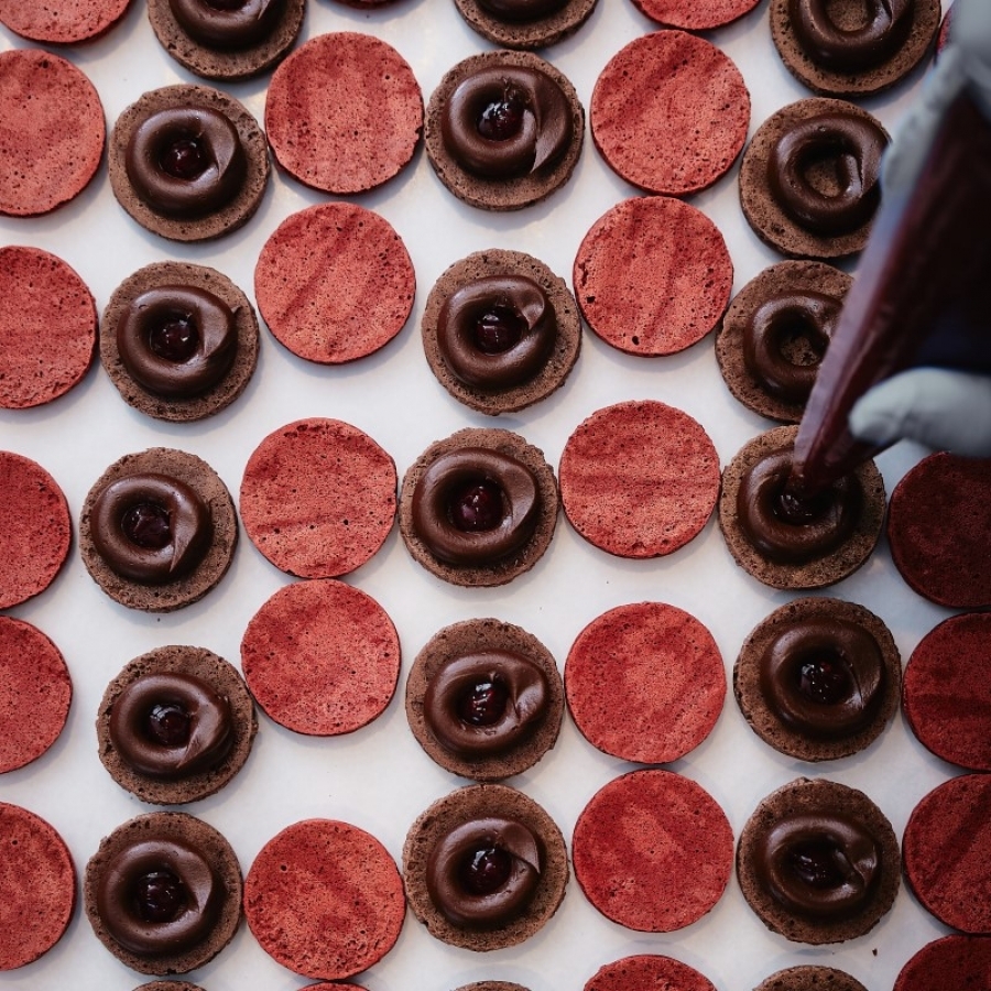 やわらかな酸味の苺バターガナッシュにグリオットチェリーのコンフィチュールを詰めてピスターシュキャラメル