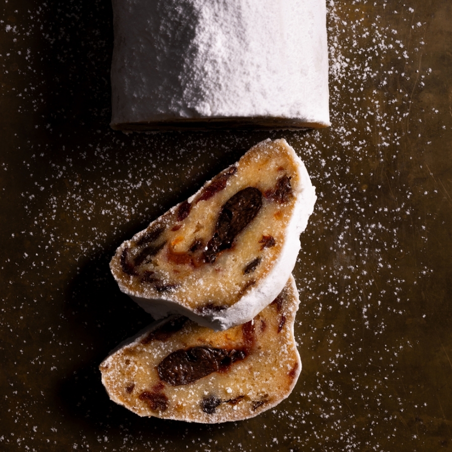 ラム酒に数ヶ月漬け込んだアプリコットやドライフルーツ、アクセントに赤ワインとスパイスで煮込んだ無花果とプルーンをまるごと加え、アーモンドやバターをたっぷり練り込んだ本格派シュトーレン。