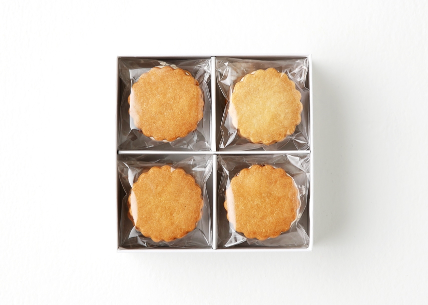 小麦粉、砂糖、バター、卵、塩の5つの基本材料で作ったサブレです。ホワイトチョコレート風味のバタークリームとラム酒風味のレーズンをサンドした少し贅沢でこだわりのレーズンサブレです。