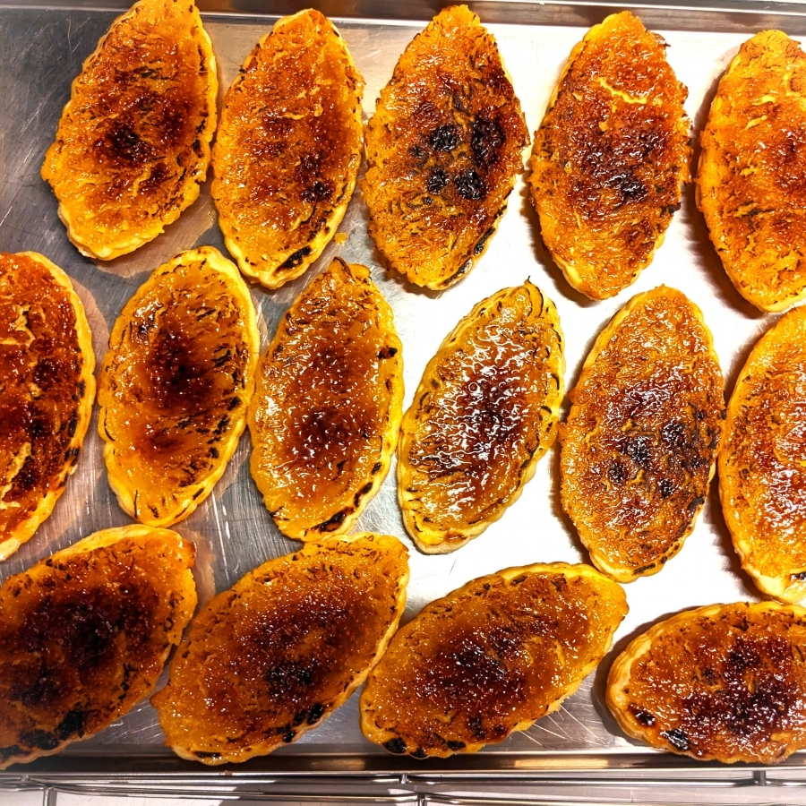 金沢のサツマイモ、五郎島金時芋を主役に安納芋を練り入れた、まさに芋の美味しさを打ち出したスイートポテトです。白餡を加えて上品な甘さを添え、卵のコクと、バターと生クリームの濃い乳味を練り入れた芋餡を、銅鍋に入れて、強火で一気に炊き上げます。熱電動の高い銅鍋で、水分を飛ばしながら炊くことで、やがてねっとり濃密に甘みを増した芋餡は、職人が一つ一つパイ生地の上に手絞りします。ここから、高温のオーブンで、パイ生地からサクッと芳ばしさが溢れ出すまで焼き上げて完成。ル・クールの「おいもさん」は、いくつもの工程を経て、こっぼこぼ(金沢弁で甘くてほくほくしたという意味)な美味しさに辿り着きました。