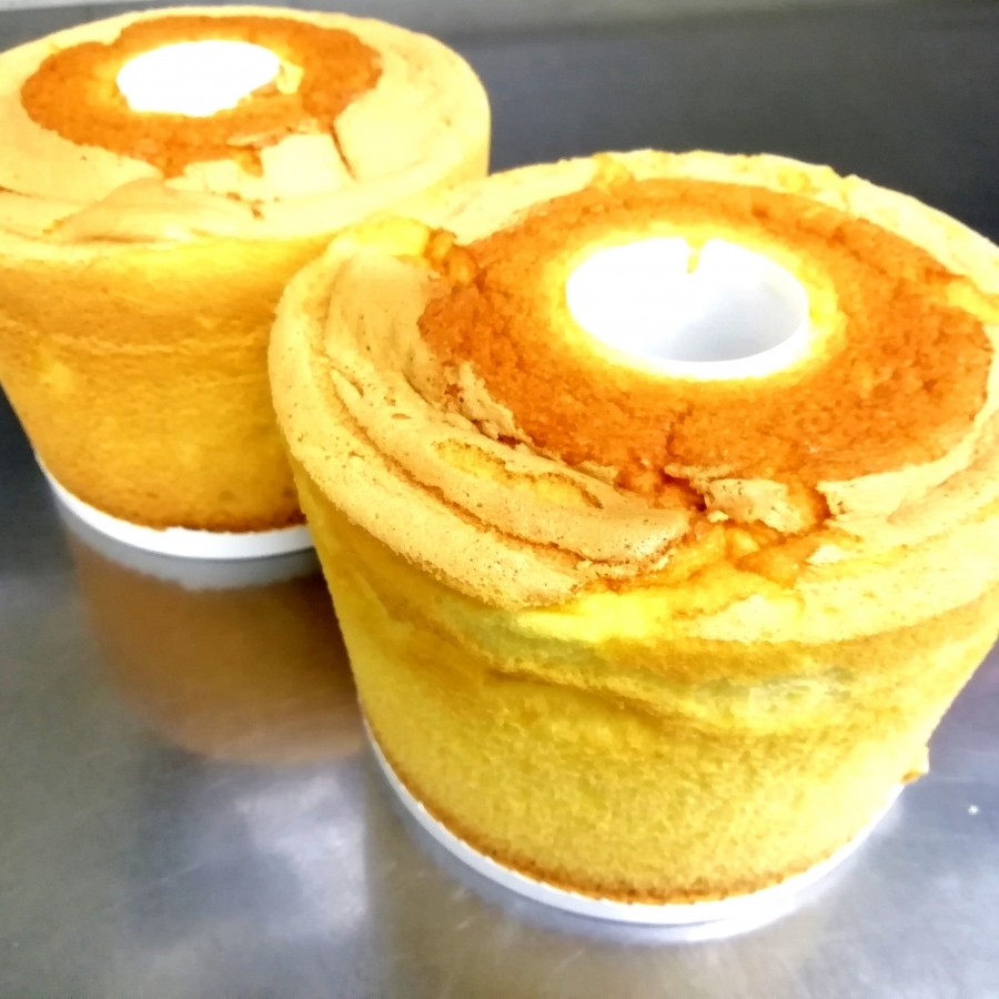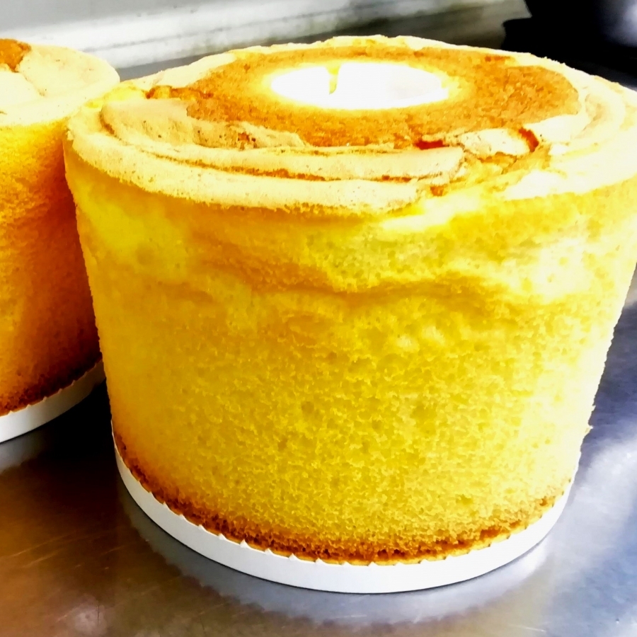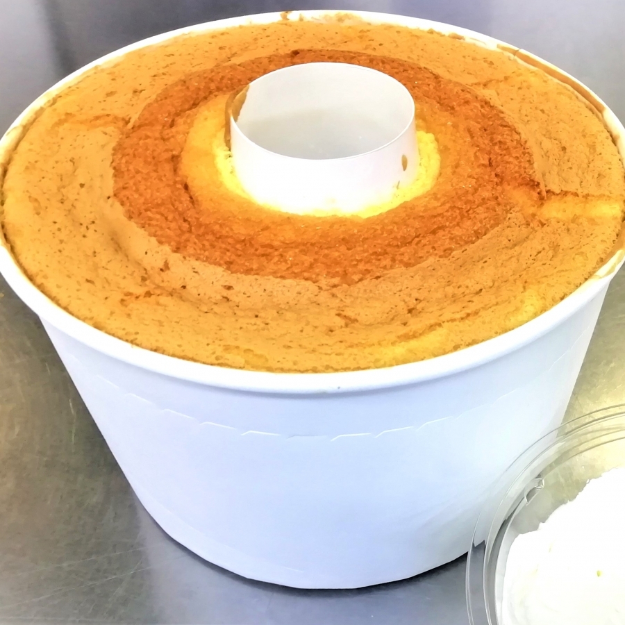 直径16cm、高さ10cmの、紙製シフォン型に目一杯の生地が入った状態です。1台で5〜6人分が目安です。
