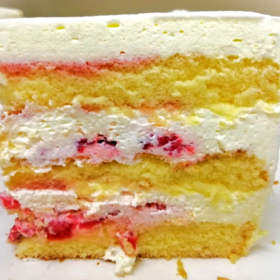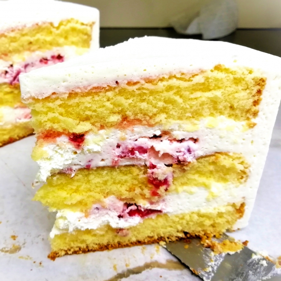 高さ8cmの生クリームの壁(と呼べるくらい背が高いのが特徴)の中はどんなだろう。ケーキを切る前に想像を楽しんでワクワクしていただだき、そして、カットすると分厚いスポンジ3層で生クリームをたっぷり分厚くサンドした断面に思わず笑顔になってしまう、そんなデコレーションケーキを食べてほしいと思ってお作りしております。